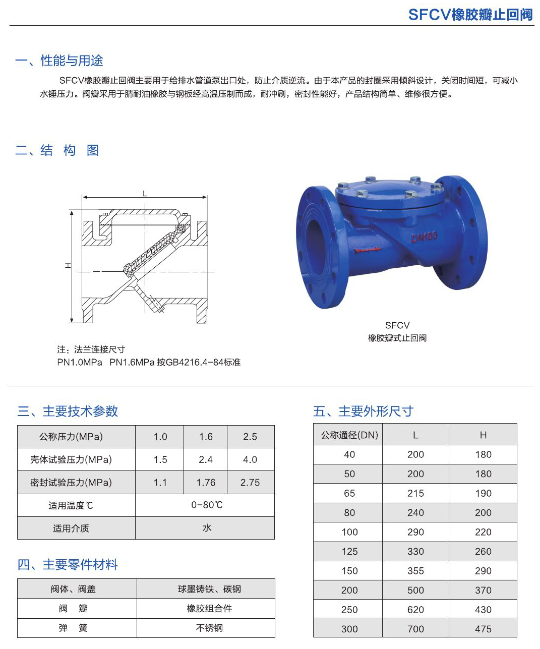 SFCV橡膠瓣止回閥主要用于給排水管道泵出口處,防止介質逆流。同于本產品的封圈采用傾斜設計,關閉時間短,可減小水錘壓力。閥瓣采用于腈耐油橡膠與鋼板經高溫壓制而成,耐沖刷,密封性能好,產品結構簡單、維修保養很方例。
