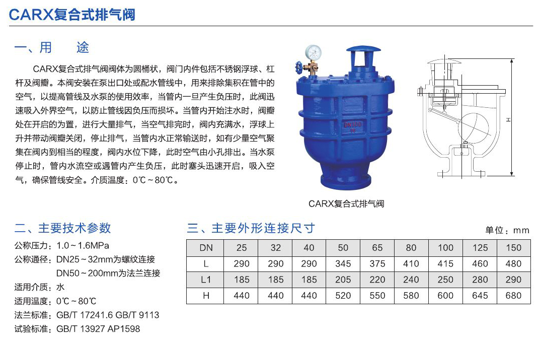 CARX復合式排氣閥閥體為圓桶狀,閥門內件包括不銹鋼浮球、杠桿及閥瓣。