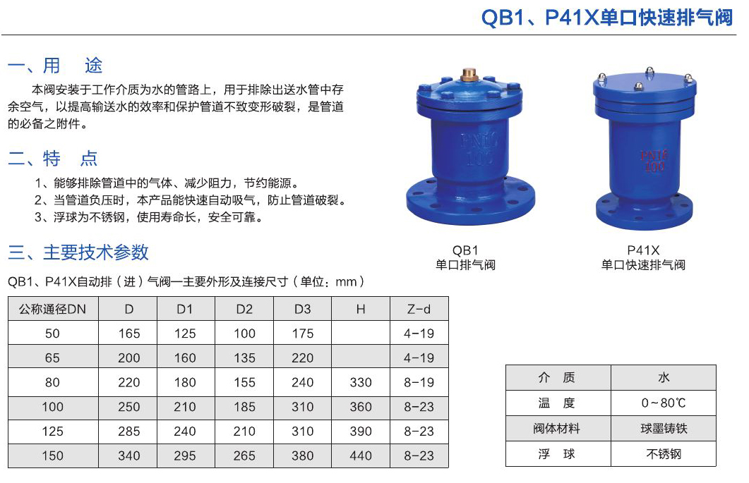 本閥安裝于工作介質(zhì)為水的管路上,用于排除出送水管中存余空氣,以提高輸送水的效率和保護(hù)管道不致變形破裂,是管道的必備之附件。
