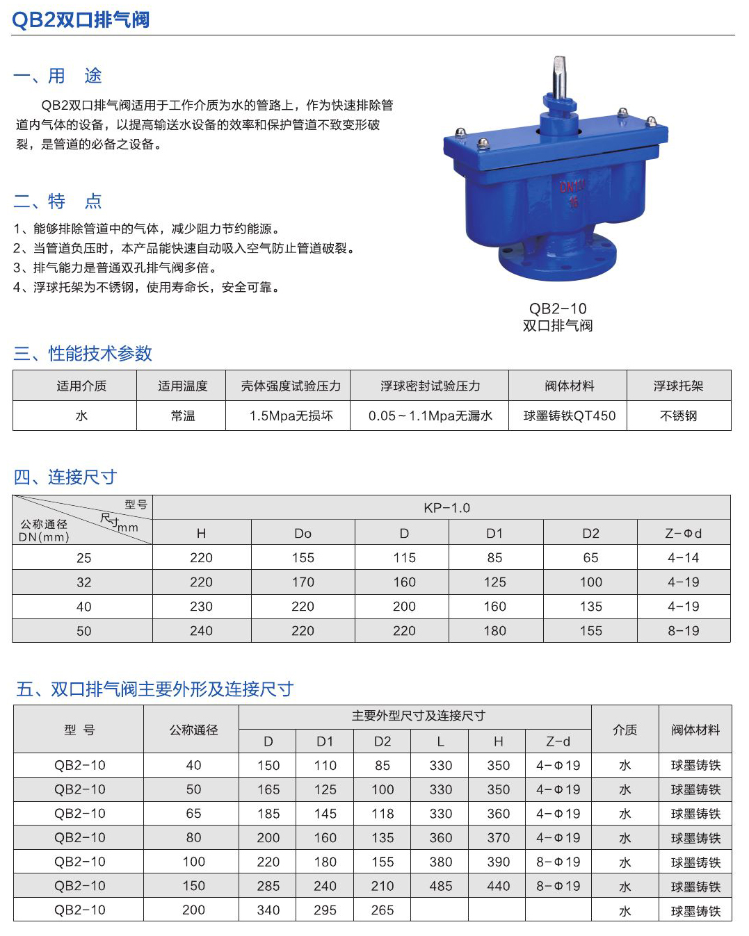 QB2-10雙口排氣閥適用于工作介質為水的管路上,作為快速排除管道內氣體的設備,以提高輸送水設備的效率和保護管道不致變形破裂,是管道的必備之設備。