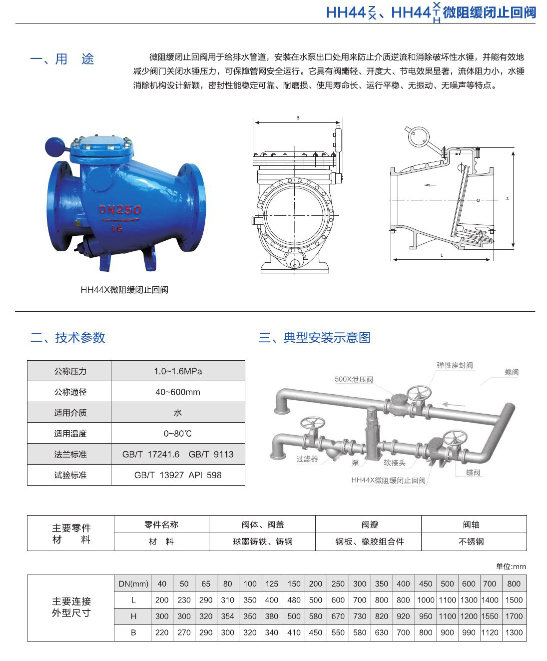 微阻緩閉止回閥用于給排水管道,安裝在水泵出口處用來防止介質(zhì)逆流和消除破壞性水錘,并能有效地減少閥門關(guān)閉水錘壓力,可保障管網(wǎng)安全運行。