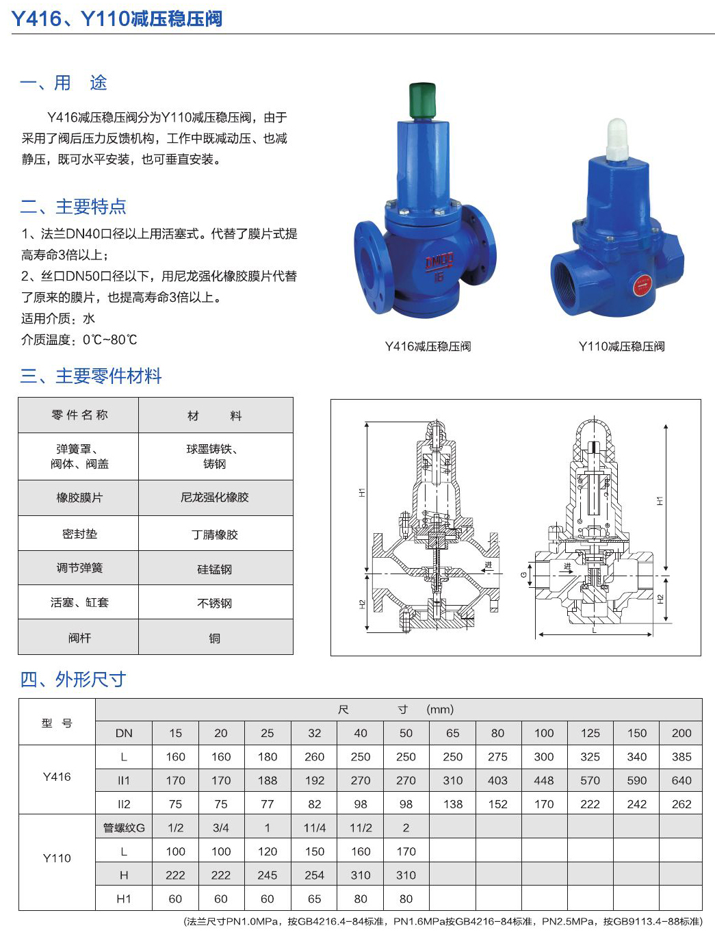 Y416減壓穩壓閥分為Y110減壓穩壓閥,由于采用了閥后壓力反饋機構,工作中既減動壓、也減靜壓,既可水平安裝,也可垂直安裝。