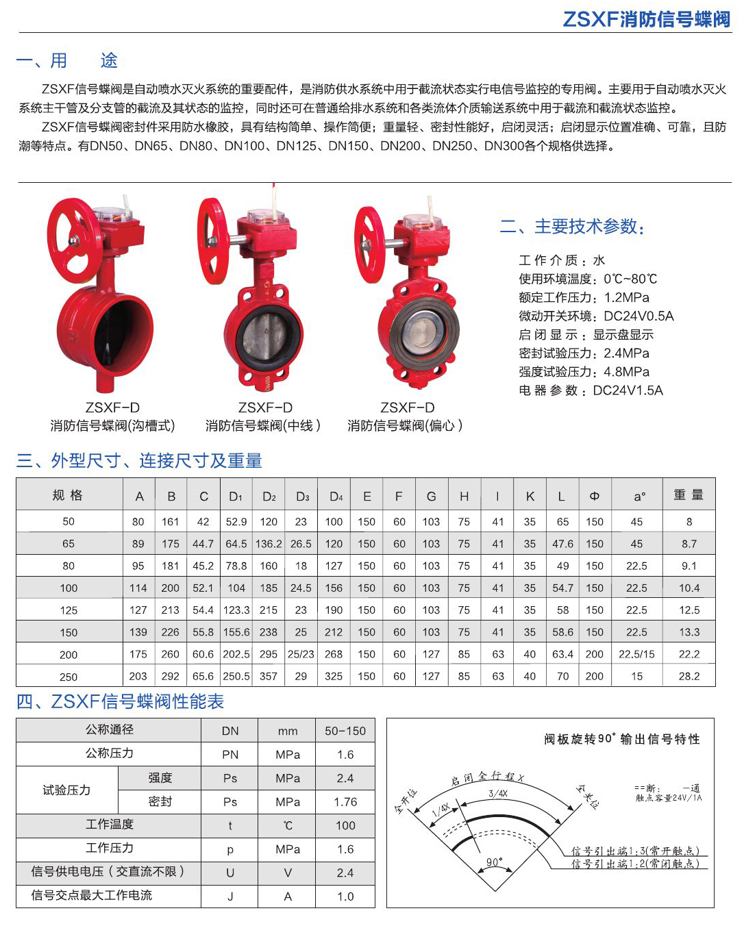 ZSXF信號蝶閥是自動噴水滅火系統的重要配件,是消防供水系統中用于截流狀態實行電信號監控的專用閥。主要用于自動噴水滅火系統主干管及分支管的截流及其狀態的監控,同時還可在普通給排水系統和各類流體介質輸送系統中用于截流和截流狀態監控。