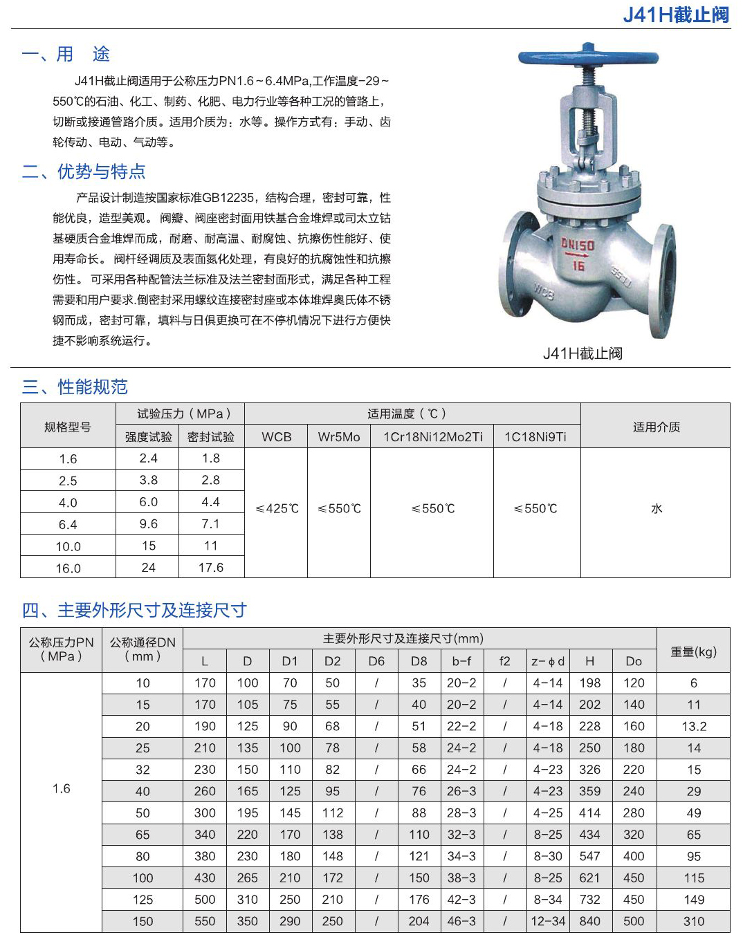 J41H截止閥適用于公稱壓力PN1.6-6.4MPa,工作溫度-29~550的石油、化工、制藥、化肥、電力行業等各種工況的管路上,切斷或接通管路介質。