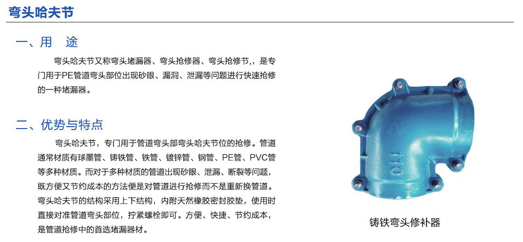 彎頭哈夫節又稱彎頭堵漏器、彎頭搶修器、彎頭搶修節,是專門用于PE管道彎頭部位出現砂眼、漏洞、泄漏洞等問題進行快速搶修的一種堵漏器。