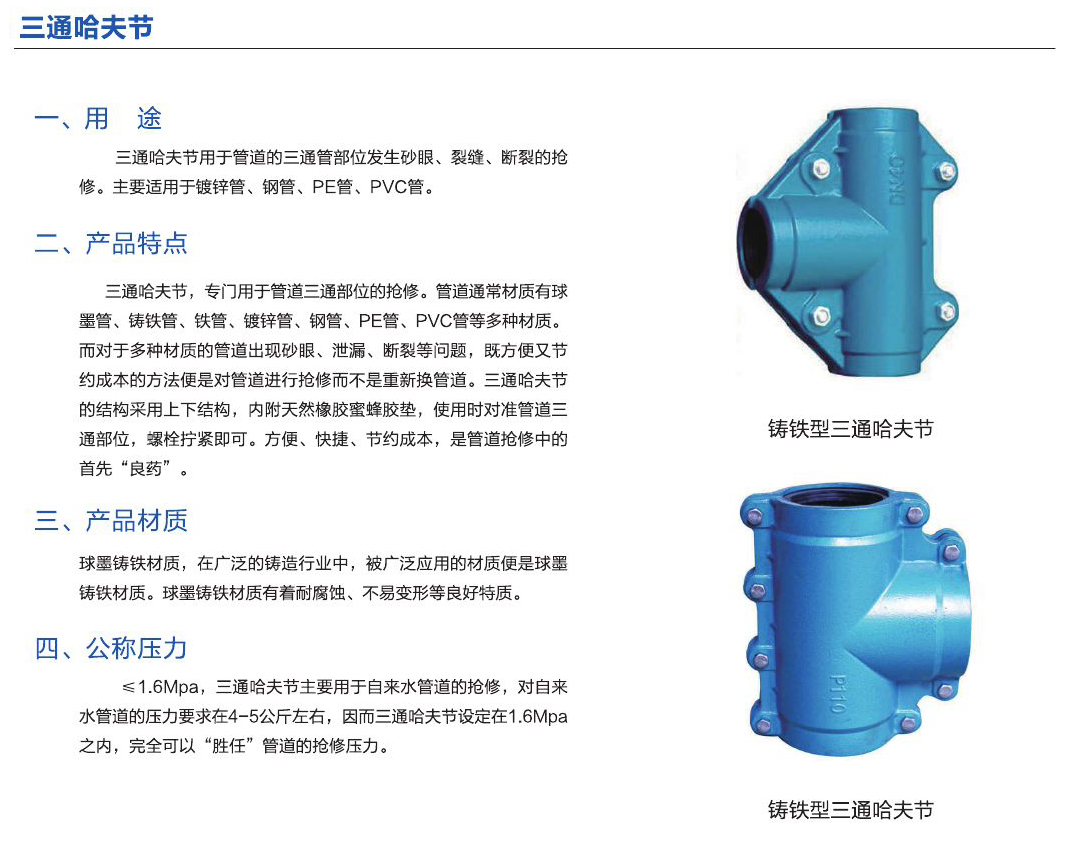 三通哈夫節用于管道的三通管部位發生砂眼、裂縫、斷裂的搶修。主要適用于鍍鋅管、鋼管、PE管、PVC管。